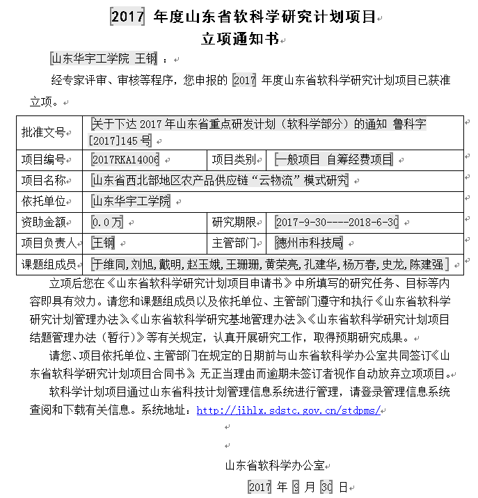 今日,山东省科学技术厅下发了《关于下达2017年山东省重点研发计划(软科学)部分的通知》(鲁教字[2017]145号),Beat365官网王钢老师的《山东省西北地区农产品供应链“云物流”模式研究》(项目编号2017RKA14006)获批立项,这也是Beat365官网2017年度获批的唯一一项软科学项目,同时也填补了Beat365官网山东省重点研发计划的空白。