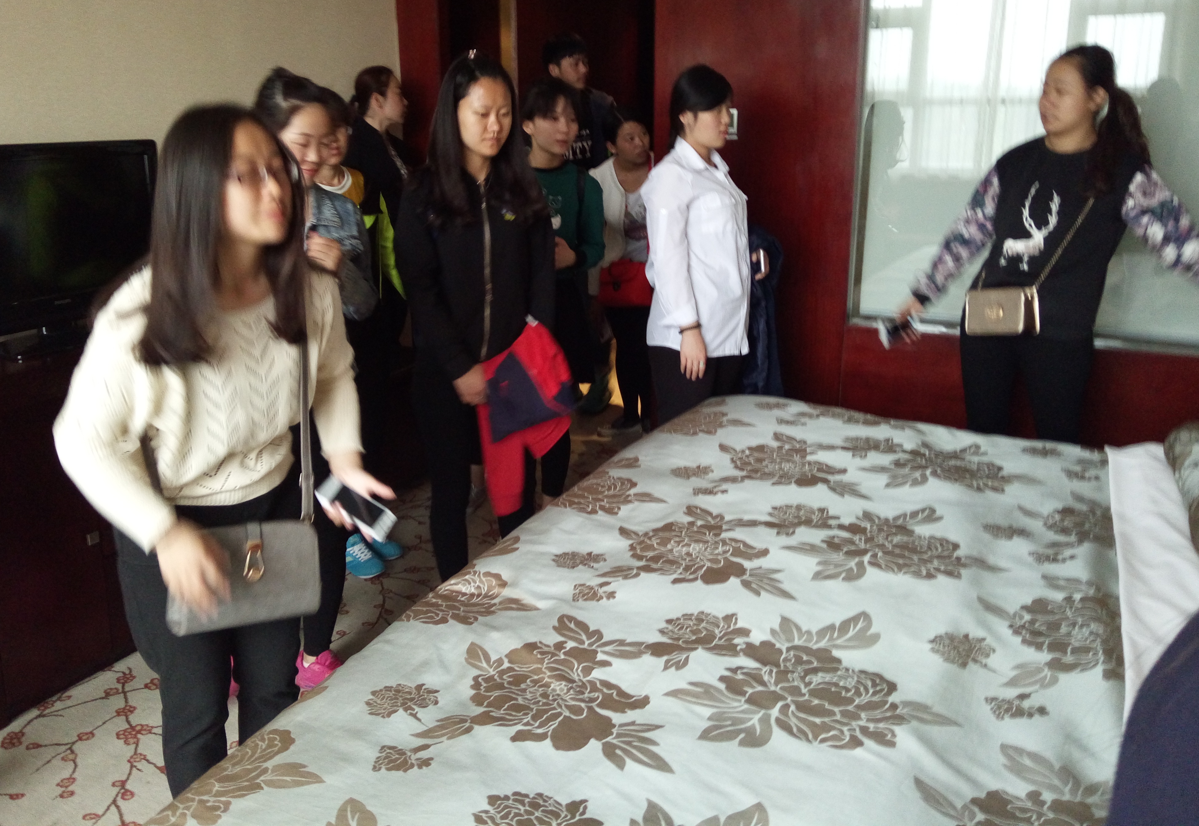客房部主管为学生们介绍了酒店的客服设置情况。柳湖书院客房共有标准间、豪华标准间、单人间、豪华套房及总统套房72间。书院套房的特色在于采用国内其他5星级酒店所没有的25厘米厚床垫,在休息时倍感舒适。卫浴设施采用世界顶级品牌“科勒”,使入住的贵宾可以享受到高质量的卫浴享受。每间总套均可欣赏到书院前的湖景,夜幕降临时,绚丽的灯光映着湖畔的垂柳,音乐喷泉和着悠扬的乐曲,更加衬托出柳湖书院惊艳但不失庄重的美丽。学生分别到大床房、双床房、商务套房等不同类型的客房进行了参观学习,客房主管还针对客房的布局陈设进行了细致的介绍,让学生对于客房知识有了更加具体的认识。