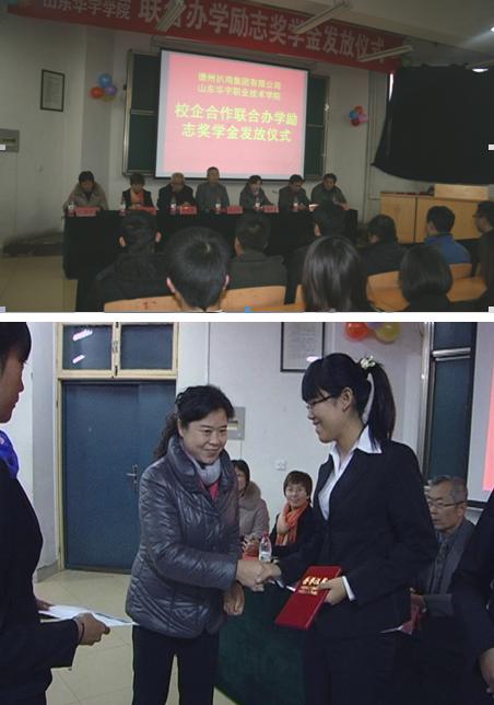 2012年11月27日下午4点30分德州扒鸡集团山东华宇学院联合办学励志奖学金发放仪式在6#101隆重举行。