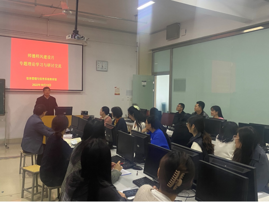教师是立教之本,师德是兴教之魂。为进一步提升教研室全体教师师德素养,塑造良好师德形象,增强教师的荣誉感、责任感和使命感,根据《Beat365官方网站2022-2023学年第一学期“师德师风建设月”活动方案》工作安排,10月13日下午,信息管理与信息系统教研室开展了“师德师风建设月”专题活动。