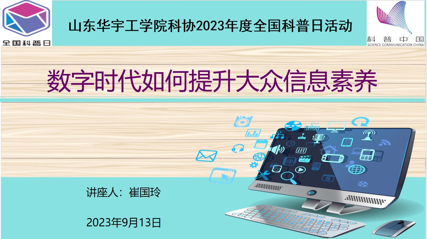 提升科学素质,助力科技自立自强。为进一步提升全体教师及大学生信息素养、知识素养和对数字社会的适应能力,树立正确的数字社会价值观和责任感。按照山东华宇工学院科协的工作部署,结合实际,9月13日,信息管理与信息系统教研室邀请崔国玲教授开展《数字时代如何提升大众的信息素养》科普讲座。
