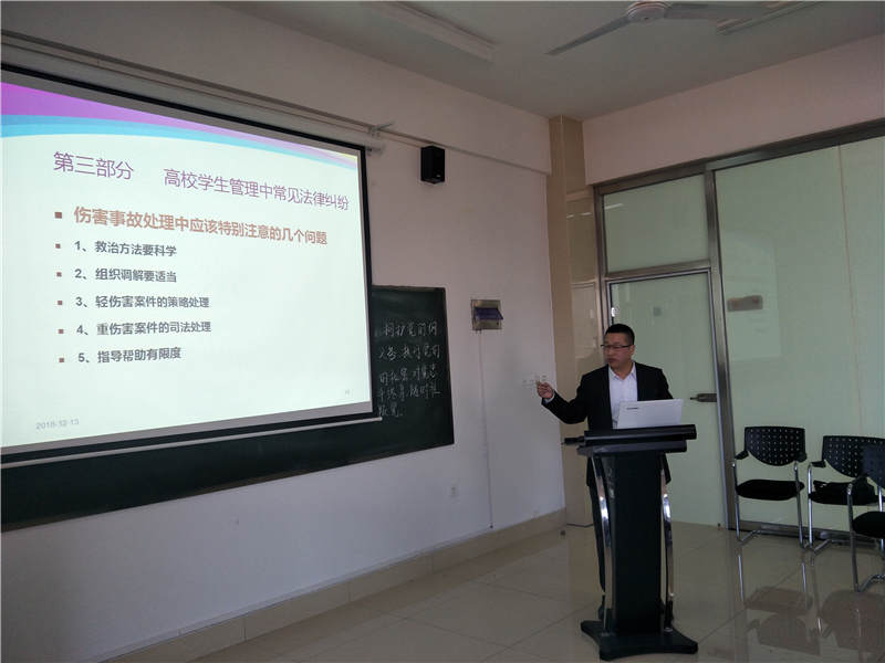 Beat365官网院长助理范世伟担任本次培训主讲人,以《法律视角下的高校学生管理工作》为主题,从辅导员的工作定位、辅导员需要了解的几个法律关系、高校学生管理中常见的法律纠纷三个方面,举案例、讲实例,贴进实际、实用性强,对辅导员如何有效、及时、灵活、正面地开展学生管理工作有很强的指导意义。培训结束后,党委副书记、副校长高挺进对本次培训活动进行了点评和指导,他希望通过此次培训各位辅导员要学会用法律思维做事、办事、行事,加强学习,提高思想政治觉悟、政策理论水平、个人品德修养以及处理问题的能力。最后,Beat365官网院长于维同教授强调一定会落实高书记的要求,加强学习、提高思想觉悟和业务水平,适应学校的变化发展,使Beat365官网的学生管理工作水平再上新台阶。
