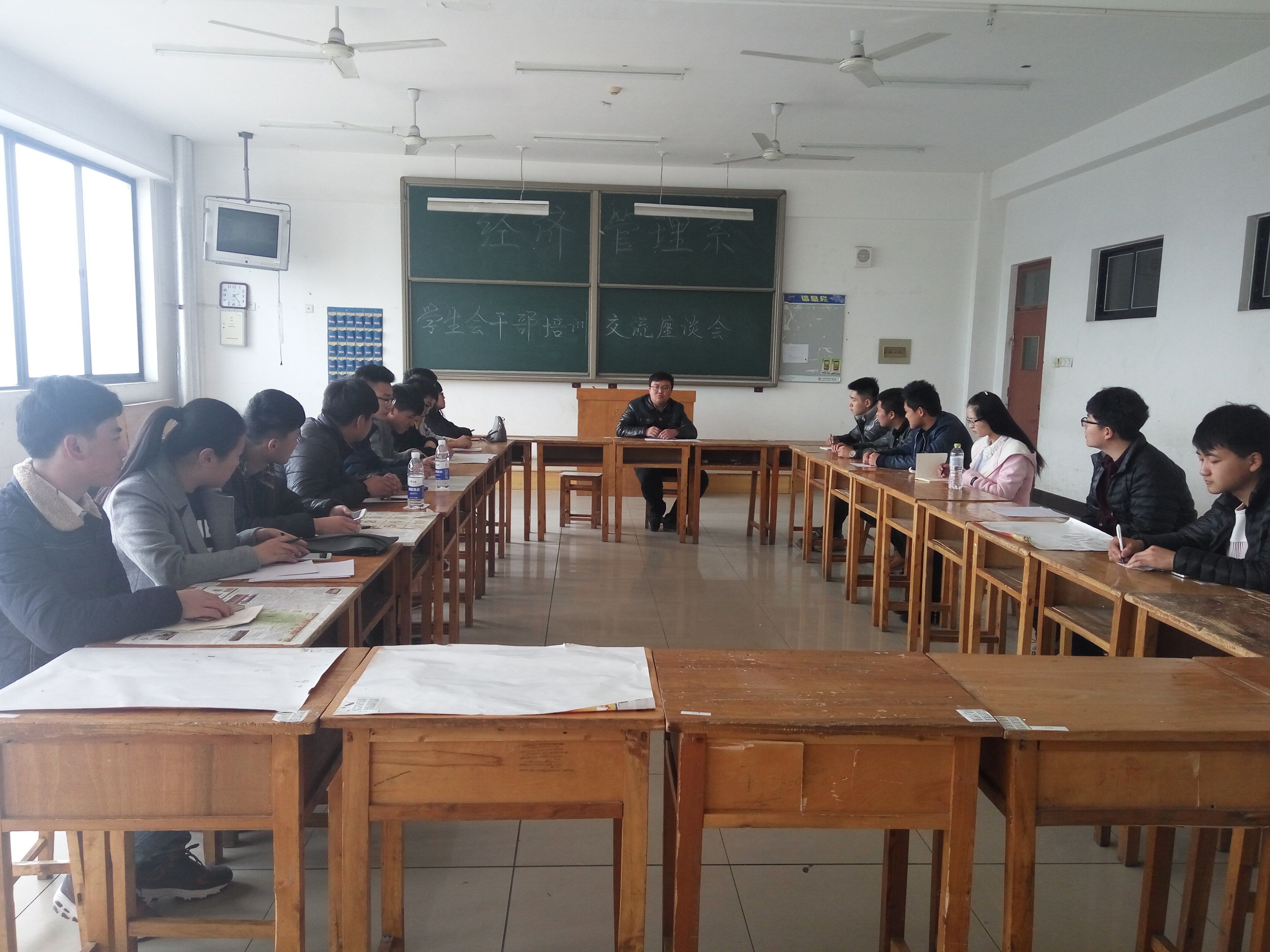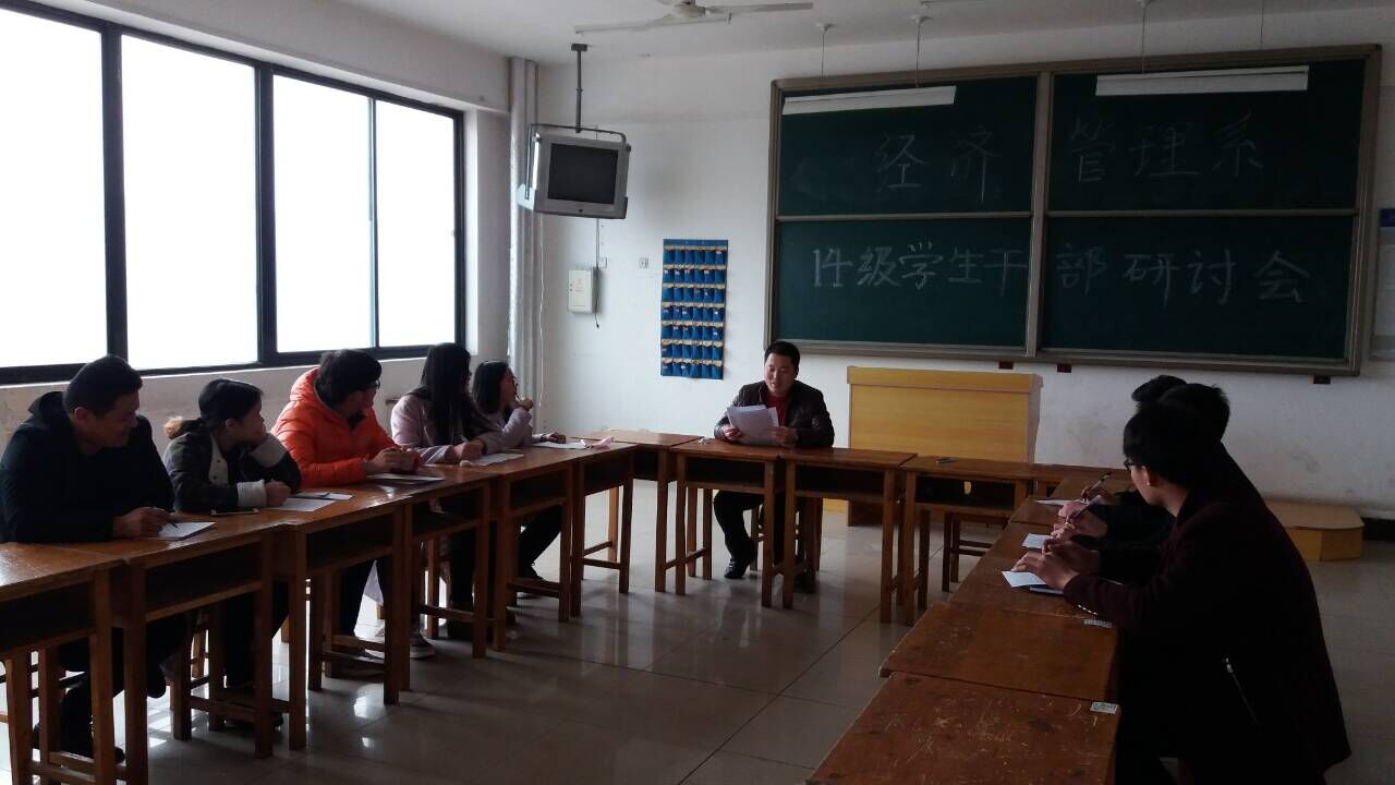 为贯彻落实院团委工作要求,提高学生干部的综合素质,完善学生干部工作章程,增强其责任意识、大局意识,提高学生干部的组织管理能力和创新实践能力。2月27日下午14点30分,经济管理系组织学生干部,针对2015年在学生干部管理中出现的问题,在10#413、415、417三个教室,由三位辅导员分别组织70余名学生干部进行了分组讨论座谈。