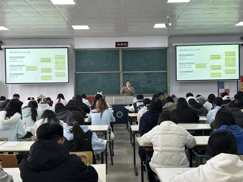 培训伊始,范老师结合高校学生心理特点,阐释心理健康核心标准,强调其是情绪稳定、认知清晰等多维度动态平衡,而非无病状态”。随后范老师分享了朋辈辅导员及时干预同学抑郁倾向的案例,强化学员责任认知并进一步强调了朋辈因年龄、认知相近易获信任,是心理防护第一防线”。最后,范老师强调在工作原则上,要做到尊重保密、客观中立、量力而行核心,明确需严格保密、避免主观评判,同时界定职责边界,要求严重心理问题一定及时反馈给辅导员。