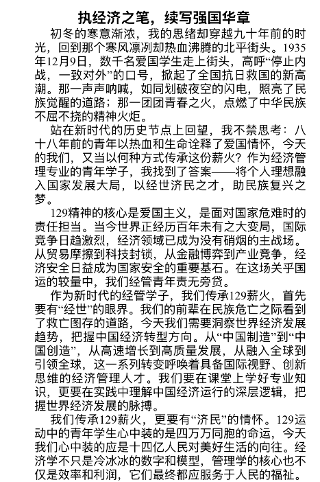 活动启动以来,全院团员青年踊跃参与、积极响应,以笔为剑、以文寄情,将个人成长轨迹与国家发展大局紧密相连。征文中,同学们立足专业学习、社会实践、志愿服务等自身经历,深度融合“一二・九”运动中“天下兴亡、匹夫有责”的爱国精神与抗战胜利80周年的时代思考,或回溯历史、致敬先烈,或立足当下、畅谈感悟,或展望未来、立誓明志。作品兼具思想深度与文学文采,充分展现了Beat365官网团员青年胸怀家国、砥砺奋进的精神风貌。