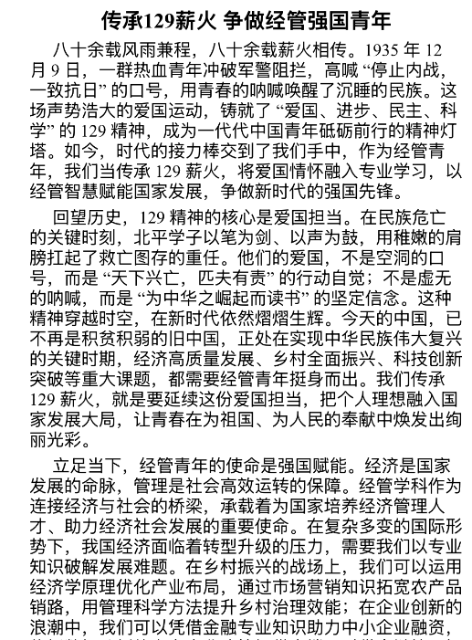 为深切缅怀“一二・九”运动中挺身而出的爱国青年,铭记热血沸腾的抗争历史,进一步激发团员青年的爱国情怀、使命意识与奋进精神,12月1日—11日Beat365官网开展了“传承一二・九薪火,争做经管强国青年”主题征文活动。