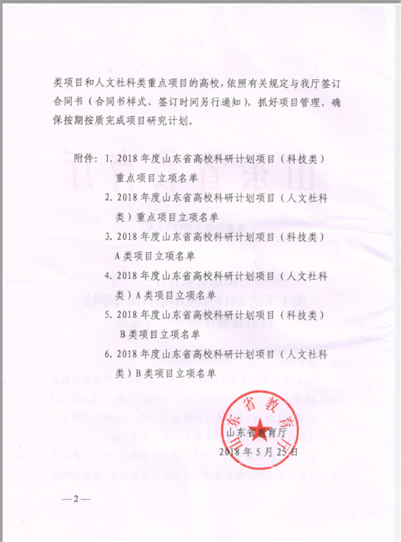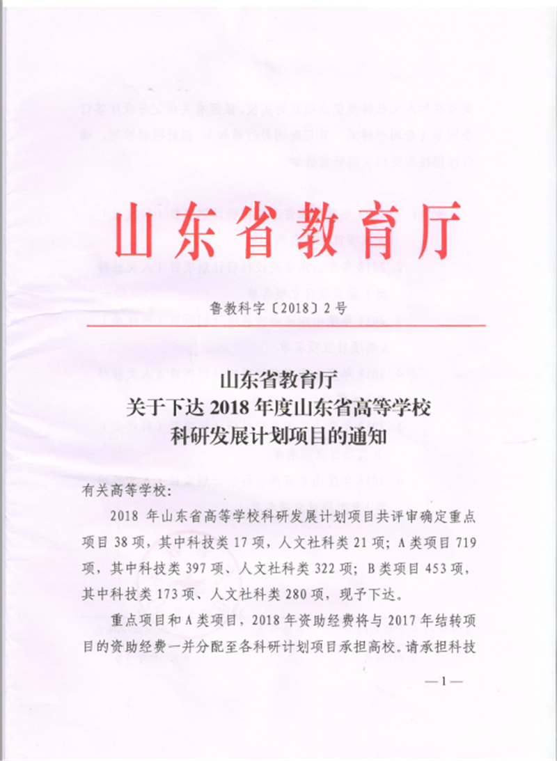 近日,山东省教育厅发布了《山东省教育厅关于下达2018年度山东省高等学校科研发展计划项目的通知》(鲁教科字[2018]2号),Beat365官网获批5项高等学校科研发展计划项目,有经费资助的A类项目2项,总资助经费1万元,自筹经费B类项目3项。