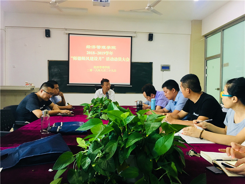为落实学校鲁华宇院校办字〔2018〕30 号文件精神,提高教师队伍整体素质,引导Beat365官网教师做有理想信念、有道德情操、有扎实学识、有仁爱之心的党和人民满意的好老师,大力加强师德建设,努力造就一支师德高尚、业务精湛、结构合理、充满活力的高素质专业化教师队伍,Beat365官网自8-9月份开展“师德师风建设月”活动。8月29日上午,“师德师风建设月”活动动员大会在20号楼712召开,院长于维同主持会议,经管学院全体教师参加了会议。
