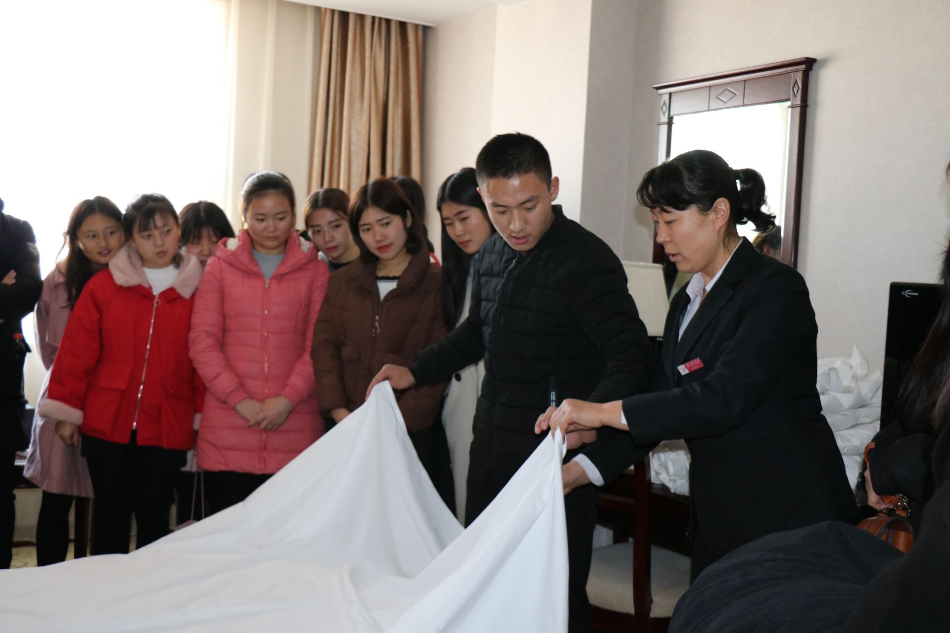 客房部主管指导学生进行中式做床练习