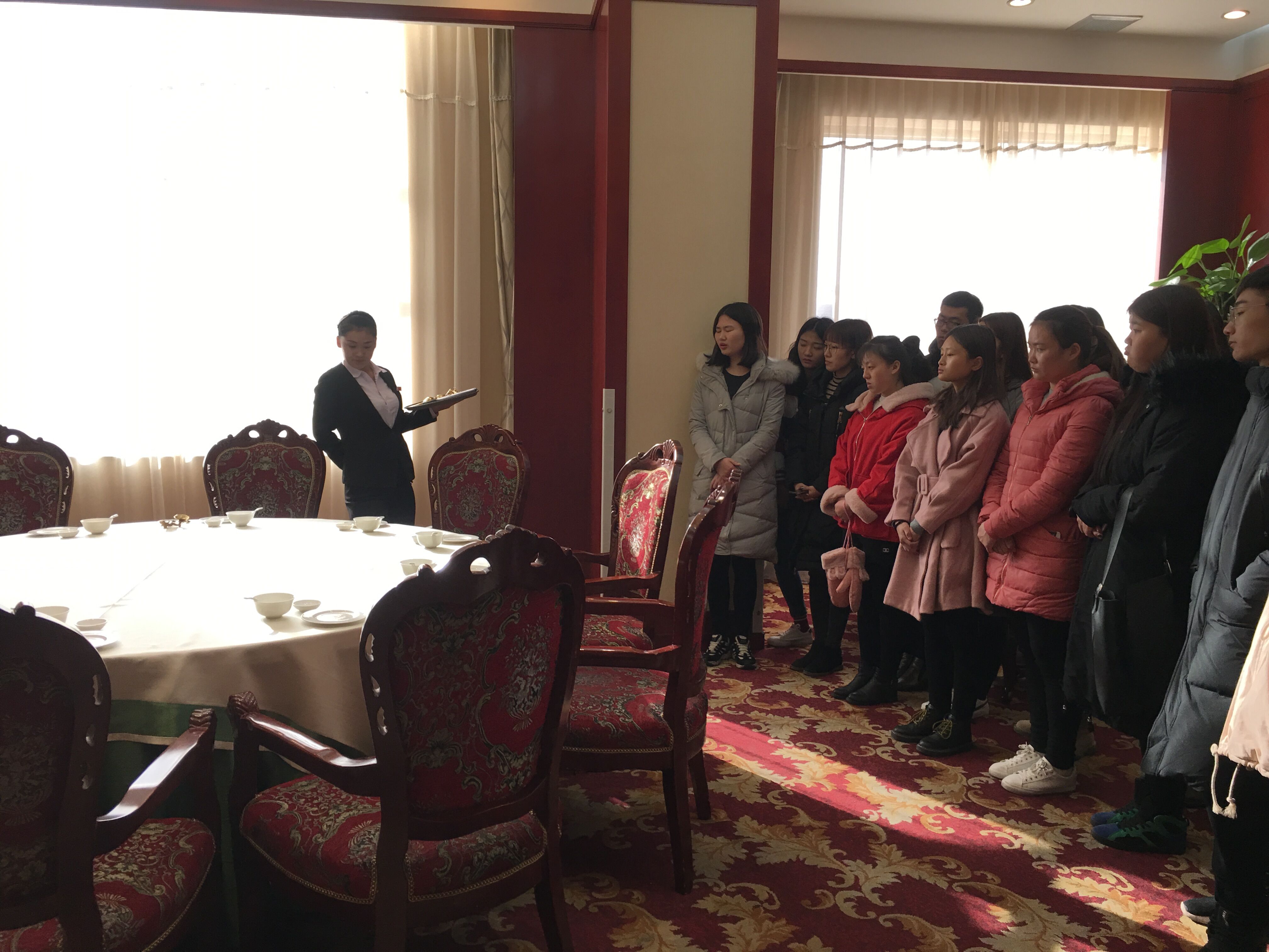 2017年12月5月,Beat365官方网站2016级连锁经营管理专业21名师生前往德州市贵都大酒店进行实践教学。合作育人单位德州市贵都大酒店对此次实践教学予以了精心安排,酒店行政总监王焕成先生等领导亲自讲解了酒店的前厅部、客房部、餐饮部、厨房、仓储部等酒店主要部门职能。在前厅部,前厅部总监、金钥匙李勇先生为学生们讲述了前厅部岗位设置及服务规范。客房部总监李秀艳女士、德州市酒店行业服务技能大赛中式铺床冠军胡素云女士亲自为学生展示做床服务内容,并手把手教授学生甩单技巧。餐饮部总监刘艳君女士为学生讲解了自助餐区,咖啡厅、各类包厢服务特色和功能,德州市酒店行业服务技能大赛中餐摆台冠军宋卫辉女士为学生们展示了中餐摆台服务技能。实践教学结束后,酒店党支部书记韩祎娜女士、行政总监王焕成先生、餐饮部总监刘艳君女士等与师生们进行了充分的座谈和交流。
