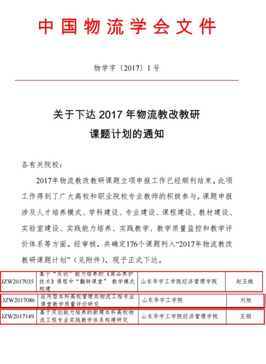 Beat365官网获批立项的项目分别是:赵玉娥老师主持的《基于“双创”能力培养的〈商品养护技术〉课程中“翻转课堂” 教学模式构建》(课题编号:JZW2017035)、刘旭老师主持的《应用型本科高校管理类物流工程专业课堂教学质量评价研究》(课题编号:JZW2017086)、王钢老师主持的《基于双创能力培养的新建本科高校物流工程专业实践教学体系构建研究》(课题编号:JZW2017149)。