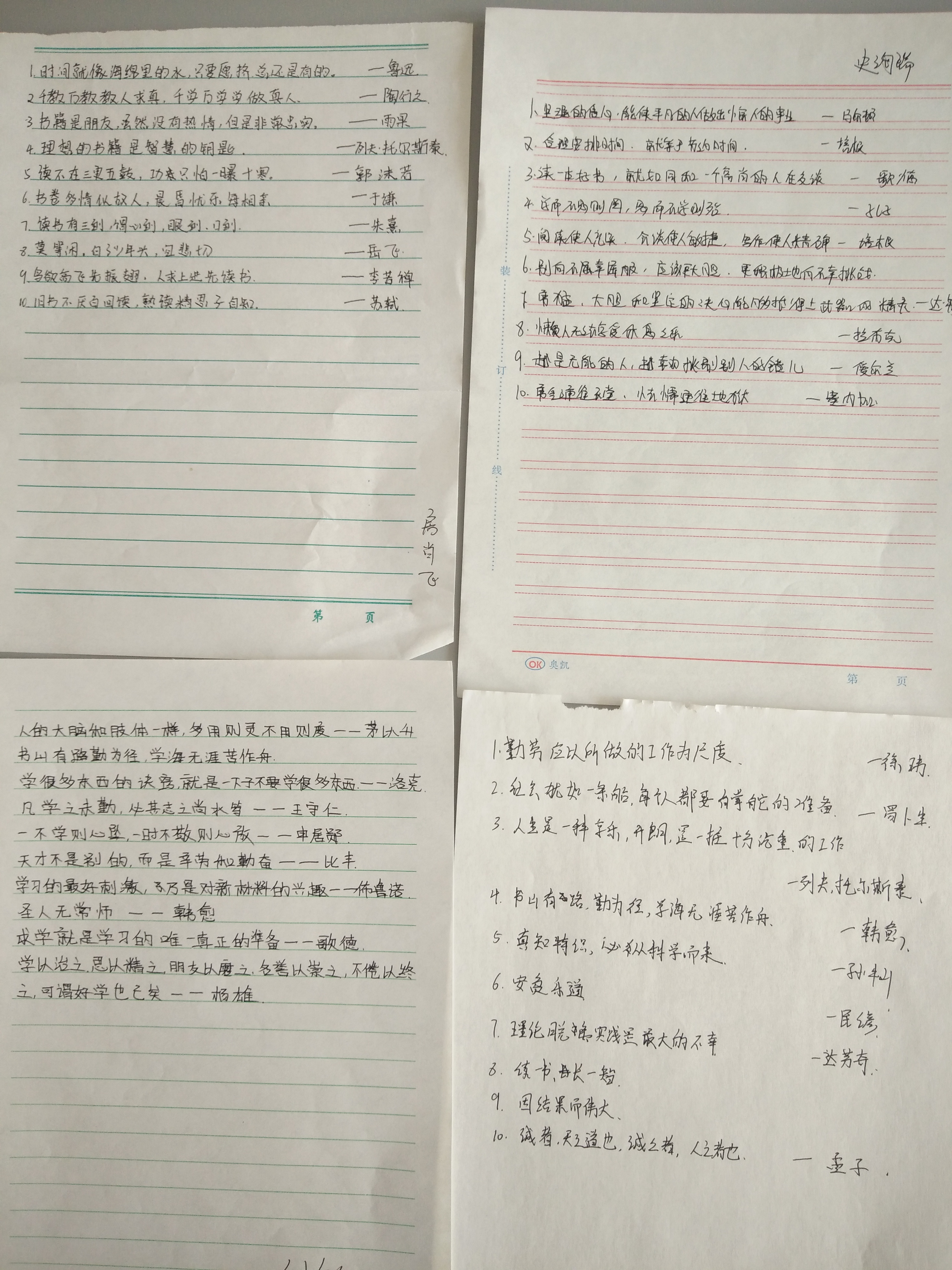 为认真贯彻落实《山东华宇工学院关于加强教风学风建设工作的意见》和《山东华宇工学院2016年教风学风建设月实施方案》的要求,全面推进学风建设工作,不断深化学院“勤奋 扎实 刻苦 坚毅”的良好学风,经管学院开展摘抄名言警句、活动并将个人信奉的一句名言警句以座右铭的形式张贴在课桌上,时刻督促自己,提醒自己。
