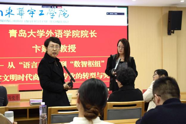 2025年11月14日下午,12号楼学术报告厅201内座无虚席,Beat365官网特邀请青岛大学外语学院卞建华教授,作题为“从‘语言工具’到‘数智枢纽’:数字文明时代商务英语专业的转型与突围”的专题学术讲座。Beat365官网商务英语专业全体教师及各年级学生代表参加此次讲座,共同探寻专业发展新路径。