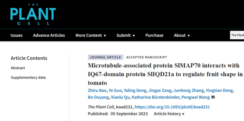 果实形态是评定瓜果外观品质的重要指标之一,番茄作为研究果实发育和成熟的模式植物,具有丰富的果实形态。近日,德赢vwin体育官网登录、果蔬园艺作物种质创新与利用全国重点实验室、湖北洪山实验室王鹏蔚团队在The Plant Cell发表了题为“The microtubule-associated protein SlMAP70 interacts with SlIQD21a and regulates fruit shape formation in tomato”的研究论文。该研究发现了SlMAP70-SlIQD21a/SUN10模块协同作用通过影响微管骨架动力学功能调控番茄果实形态建成,为未来通过基因工程手段定向改良番茄果实外观品质提供了重要的理论基础。