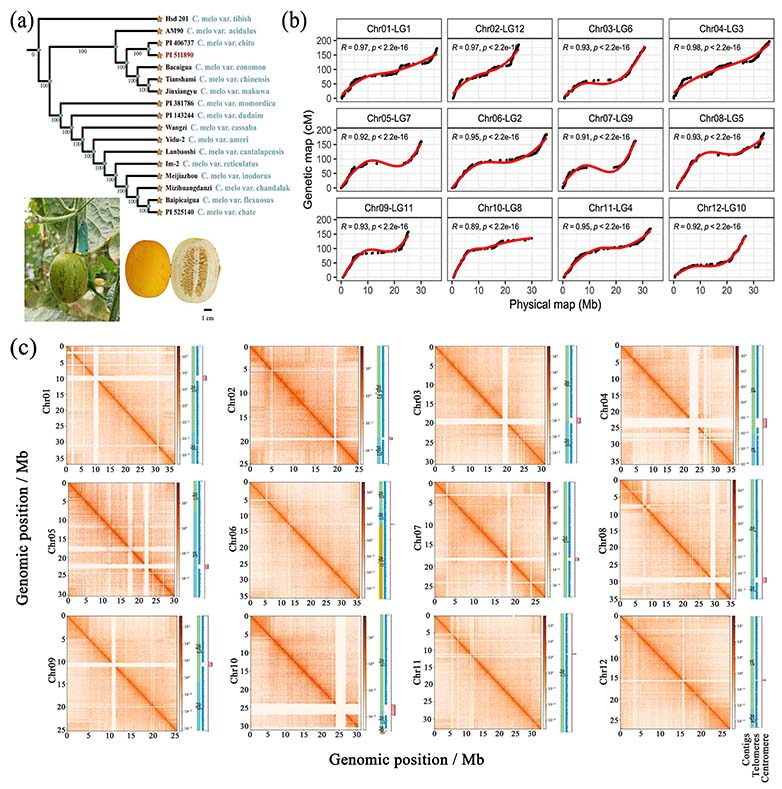 来自墨西哥的野生甜瓜种质PI511890带有蔓枯病抗性基因Gsb-3,但该基因尚未被克隆。该研究以PI511890为材料进行基因组组装,以期为克隆Gsb-3基因提供高质量的参考基因组。研究首先基于全基因组重测序数据构建了16个甜瓜园艺类群的系统发育树,发现PI511890属于C. melovarchito类群。然后,使用HiFireads和ultra-long ONTreads进行contig组装,再利用Hi-C测序数据进行染色体挂载。在挂载后的染色体序列上可鉴定到24个端粒、12个着丝粒区域和16个gaps。利用longreads和contigs对gaps进行手动填补,最终实现了T2T和gap-free水平的完整基因组的组装。该基因组大小为375.0 Mb,注释到31,556个编码蛋白质的基因。研究人员基于RIL群体的重测序数据构建了高密度遗传图谱,并通过Hi-C互作热图、BUSCO完整性评估、QV值、LAI值、contigN50和碱基准确性来评估组装的基因组质量,结果均表明PI511890基因组具有高度的组装正确性、碱基准确性、序列完整性和连续性,是目前发表的质量最高和最完整的甜瓜基因组。