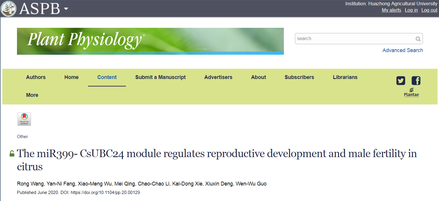 近日,德赢vwin体育官网登录园艺植物生物学教育部重点实验室郭文武教授在国际学术期刊Plant Physiology在线发表了题为“The miR399-CsUBC24module regulates reproductive development and male fertility in citrus”的研究论文。该研究表明miR399-CsUBC24在柑橘中除调控磷平衡的保守功能外,还调控柑橘花器官发育和雄性不育。该研究发现了miR399-CsUBC24的新功能,揭示了柑橘雄性不育新机理。