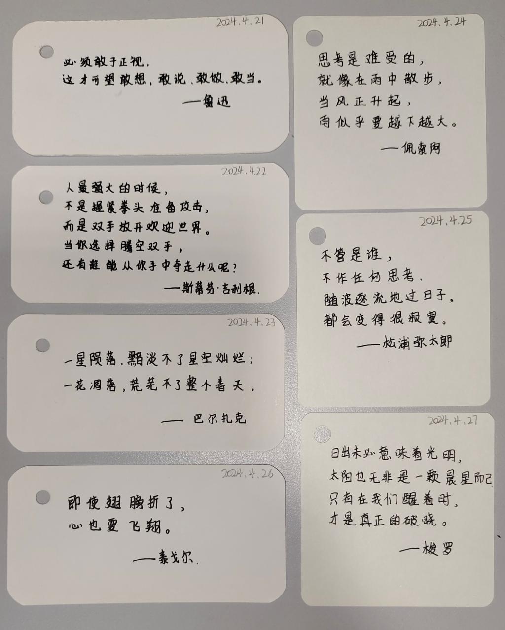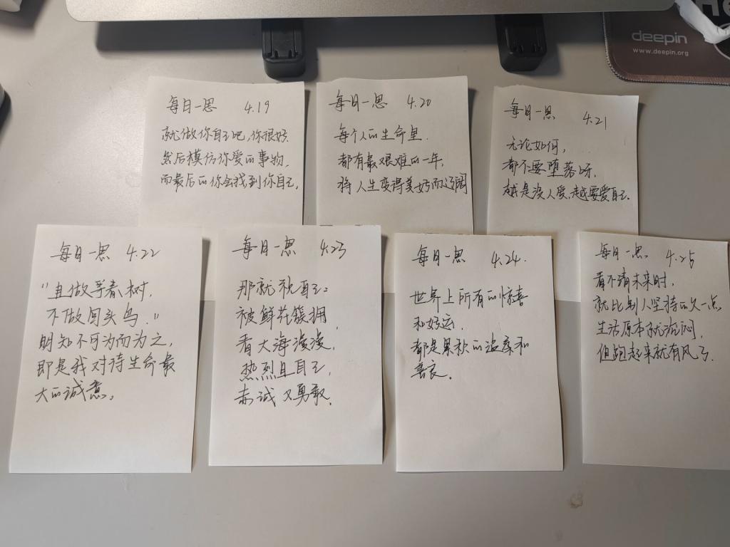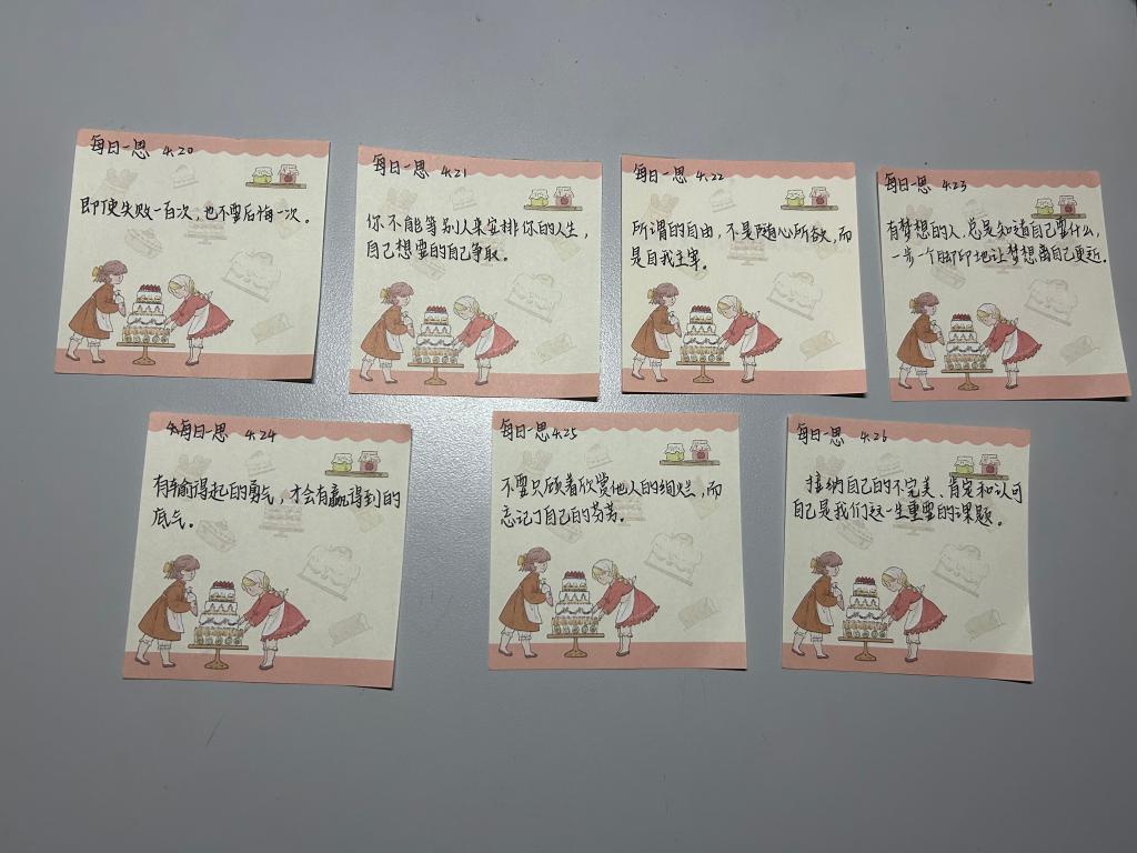 本次活动在第二课堂上发布,由班级养成教育自治小组组长以 主题宣讲的形式,在班级中进行了宣传,对活动的宗旨、内容、意义等进行了介绍,参与的同学以填写文创卡片的方式参与“每日一思之记录一周”活动。