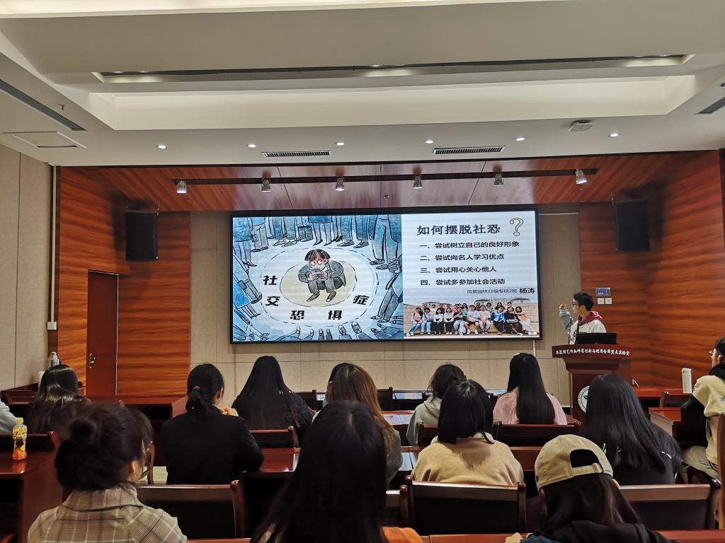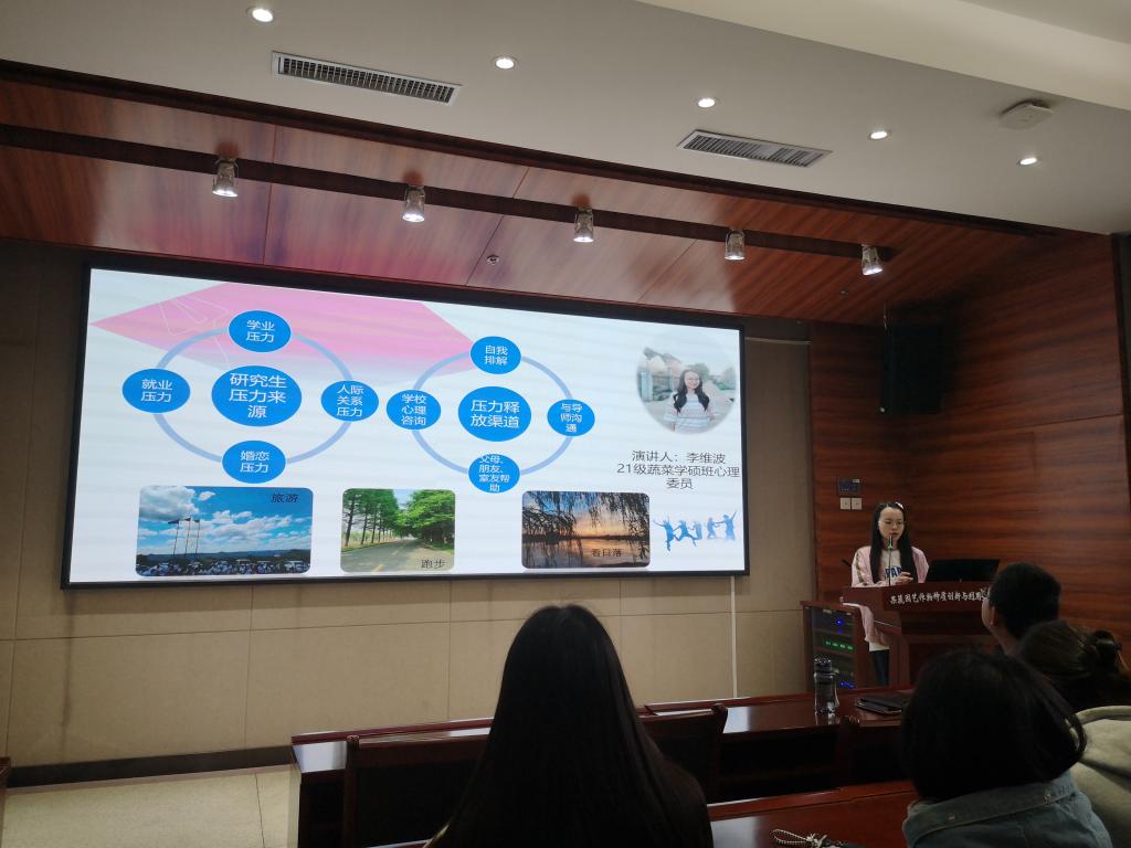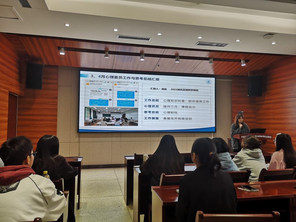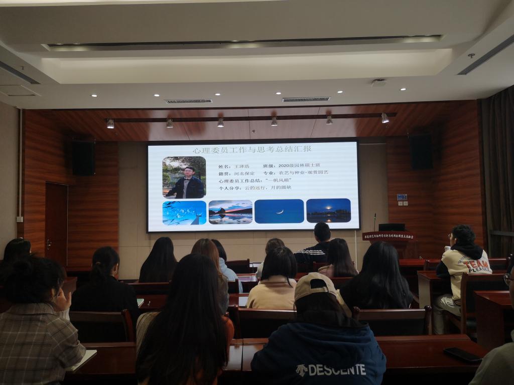 接着,研究生心理委员以演讲的方式进行月度工作总结。2021级蔬菜学硕班心理委员李维波深刻剖析了研究生压力来源,分享了压力释放的渠道。2022级风景园林学硕班心理委员凌晨谈道:“学院每月都会发送很多的关于心理健康以及防诈骗的推文,原本我也只是按要求转发,并没有过多地思考过它的作用。但有一天,我们班一位同学碰到我之后说特别感谢我转发到班级群里的推文,她说她那天整个人的状态都非常不好,突然手机屏幕亮了,她拿起来一看是我转发到群里的推文,推文名字叫《美好的春天,心灵也会偶尔感冒》,她说感觉突然被一种暖意包围,点进去慢慢看完感觉自己真的有被治愈到。那一刻我才发现,原来心委的工作真的是非常细腻而又细水流长的。”2022级风景园林专硕2班心理委员杨涛在举办班级活动的过程中发现有一部分同学很害怕参加集体活动,因此他专门为此打造了一堂班会课《如何摆脱社恐》,帮助他们打开自己,释放压力。2020级园林班心理委员王泽浩则分享了一段自己的故事。他谈到自己曾经有一段时间非常的疲惫与焦虑,于是在社交平台上发了一段比较低落的文字,“如果我是云就好了,开心时出现,不开心时可以消失”,而一位陌生网友的评论温暖了他,也给了那个时候的他不小的力量,“因为要远行,所以不能消失”。“每个人都有低落的时候,希望大家在低落的时候能尽快地调整好自己,因为我们还有很长的路要走,不能一直消失失去联络。”说完云的远行,他又分享了一段自己非常喜欢的一段关于月的圆缺的故事,“‘只能反射阳光的月亮,不能控制自己的圆缺,但他知道这些光与暗的变化都会过去,甚至喜欢这些模样,并不会因为别人看不见自己的一部分而怀疑自己,他清楚自己一直都是完整的。’我们每个人都是完整的,开心也好,悲伤难过也罢,都是最真实,最完整的自己,希望我们都可以认真地爱自己。”