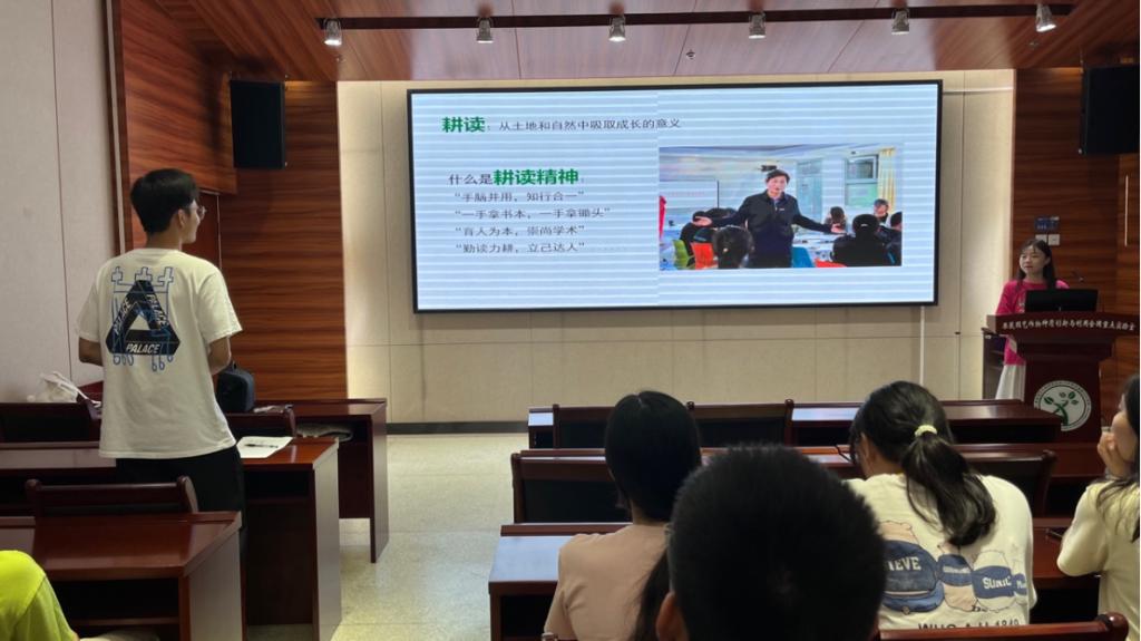宣讲中李小惠提到怎么理解耕读精神,大家积极发表自己的理解。李俊杰同学对此提出了个人的观点,作为华农学子,本着“勤读力耕,立己达人”的校训,为助力国家实现社会主义农业现代化强国,更应当从群众来到群众中去,一定要放低身段,服务三农。虚心接纳,努力学习,即使是在平凡的工作和岗位中,也要时刻保持着爱岗敬业的精神和态度,将自己的知识与实践相结合。时时仰望星空,更需脚踏实地。