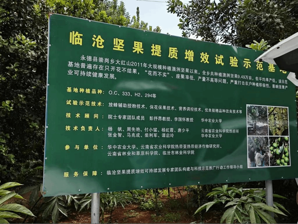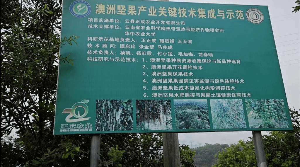 参观完澳洲坚果提质增效示范基地后,实践团来到了位于临沧市云县的澳洲坚果产业关键技术集成与示范基地。该基地的实施单位为云县正成农业开发有限公司,技术支撑单位为德赢vwin体育官网登录和云南省农业科学院热带亚热带经济作物研究所。该基地主要的研究和示范技术为(1)澳洲坚果种质资源收集保护与新品种选育(2)澳洲坚果开花调控技术(3)澳洲坚果保果技术(4)澳洲坚果病虫害监测与绿色防控技术等。该基地的主要建圃品种为桂热一号、OC、A4、A16、农试344、农试296.