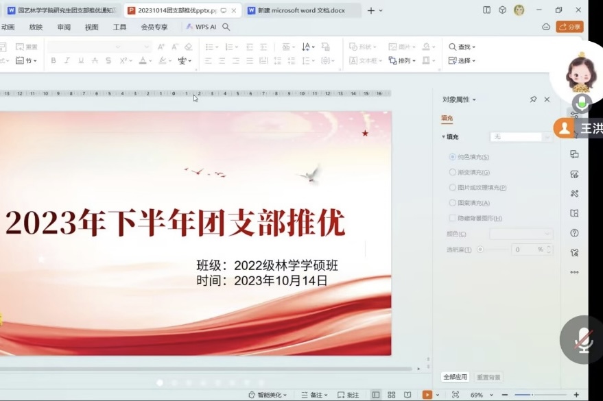 2023年10月14日中午,2022级林学学硕班召开2023下半年团员大会,本次会议由团支部书记王洪主持采用线上会议方式。本次会议共分为三个部分:推优候选人组我介绍,参会团员点评,投票与计票。